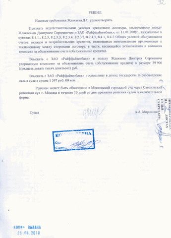 Конечно, это не единственный случай, когда в подобном споре суд принял сторону клиента банка, но большая часть разбирательств заканчивается все же не в пользу заемщиков. Кроме того, насколько мне известно, это первый случай, когда капитулировало кредитное учреждение, входящее в десятку крупнейших, а не мелкий провинциальный банк. Представители Райффайзенбанка уже заявили о намерении обжаловать решение. Так вот, если Мосгорсуд оставит его в силе, с большой долей вероятности можно ожидать, что и другие заемщики, оказавшиеся в сходных условиях, смогут выиграть дела у банков. Удачи!