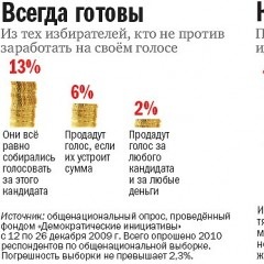 Директор социологической группы «Рейтинг» Алексей Антипович составил обобщённый портрет торговца голосом. Такой избиратель на выборы, как правило, не ходит или голосует «против всех». А главное – этот человек вовсе не обязательно нуждается в деньгах. «Прекрасно понимаю тех, кто продаёт голос, – говорит г-н Антипович. – Ими движет не желание заработать, а цинизм, рождённый в ответ на паразитизм политиков. Взять деньги – значит дать симметричный ответ власти».